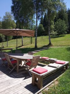 - Une terrasse en bois attenant au chalet, meublée (barbecue compris, tablecet chaises, teansats et parasol ), exposée plein sud, pour profiter du soleil du matin jusqu’au soir.
